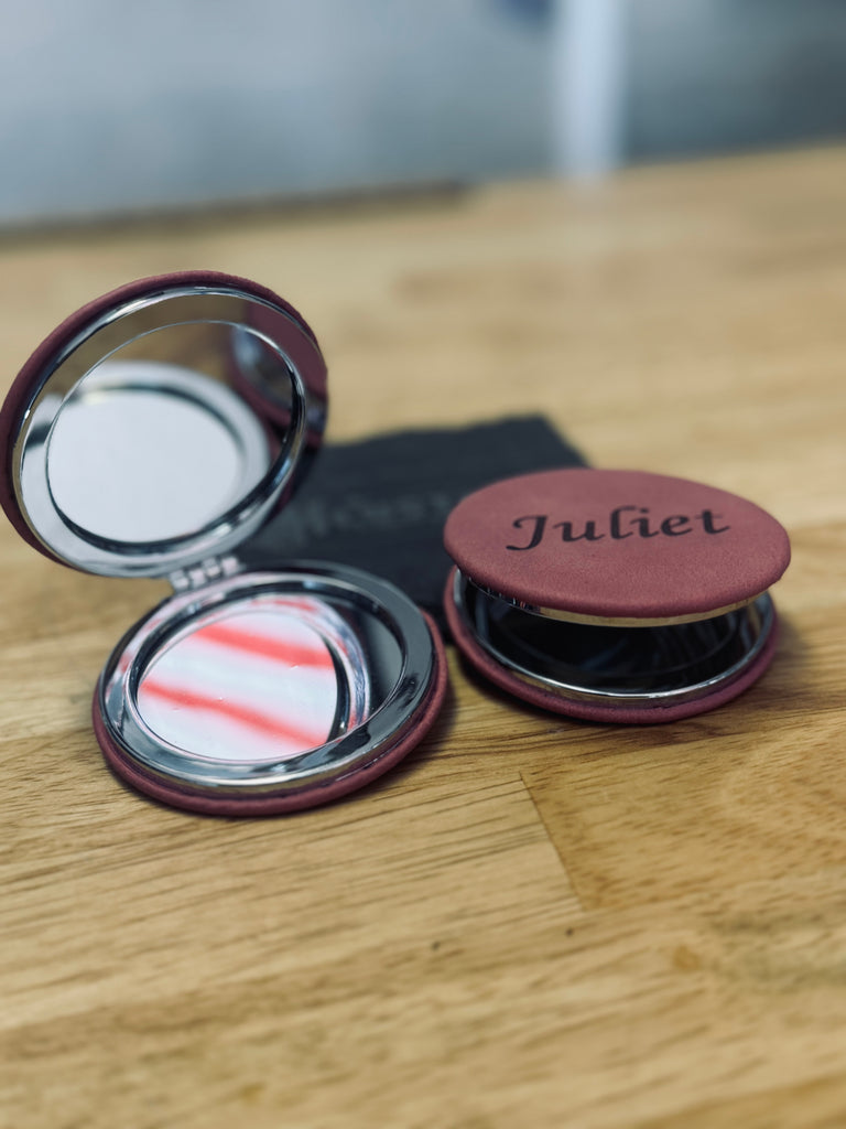 This compact mirror is available in 2 colors, perfect for holiday gifts, birthday gifts, bachelorette parties, engagement parties and bridal showers!